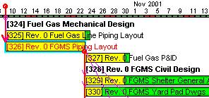 Float which can be "used up" without affecting other tasks is known as "Free Float", float which will affect the timing of other tasks is known as "Interfering Float". PlanBee shades the edges of that portion of a bar which denotes interfering float. In task 132 above, free float exists from October 8th to 8:00 am October 16th and interfering float from October 16th to November 1st. This means that task 132's finish may slip to October 16th without causing a delay to any other task. If it slips beyond that date it will affect the timing of other tasks. All of the float in task 133 is interfering float, so any slippage will affect the timing of at least one other task.
